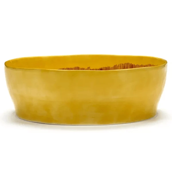 Het Serax Feast by Ottolenghi saladekom heeft een diameter van 27,5 cm en is 9,5 cm hoog. De aardewerken komis okergeel van kleur met een rode schildering.
